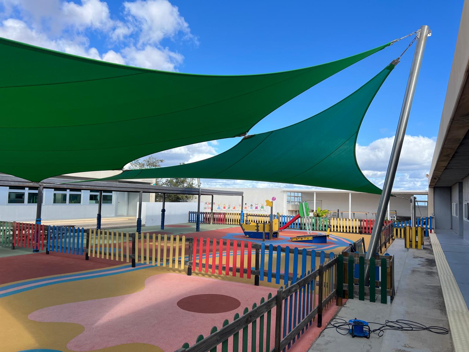 Instalación de velas sombra para parque infantil mediante membranas textiles tensadas con una superficie aproximada de 200 m².