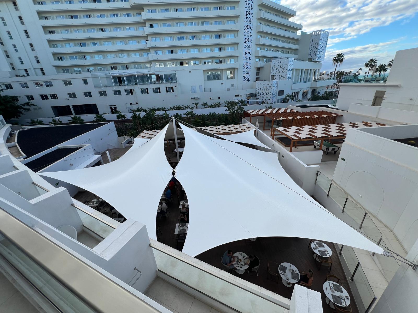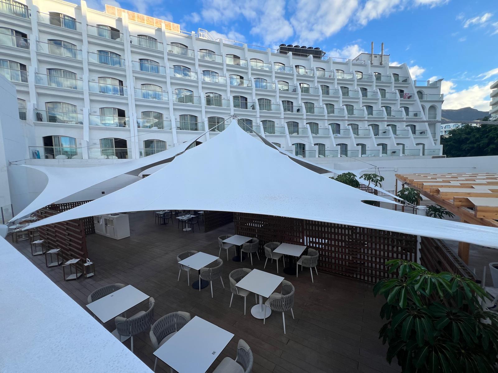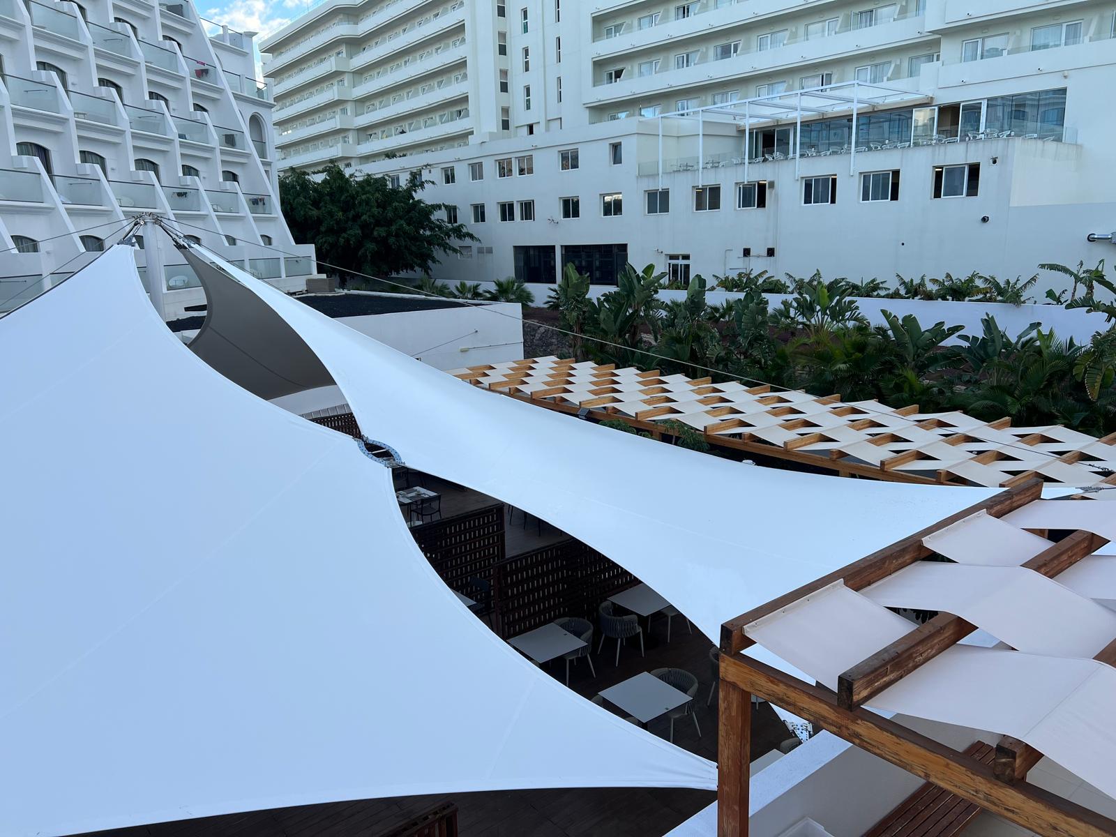 La instalación se realizó en la terraza del restaurante del Hotel Guayarmina Princess, ubicado en Adeje, Tenerife, con el objetivo de generar zonas de sombra, confort térmico y mejora estética del espacio.