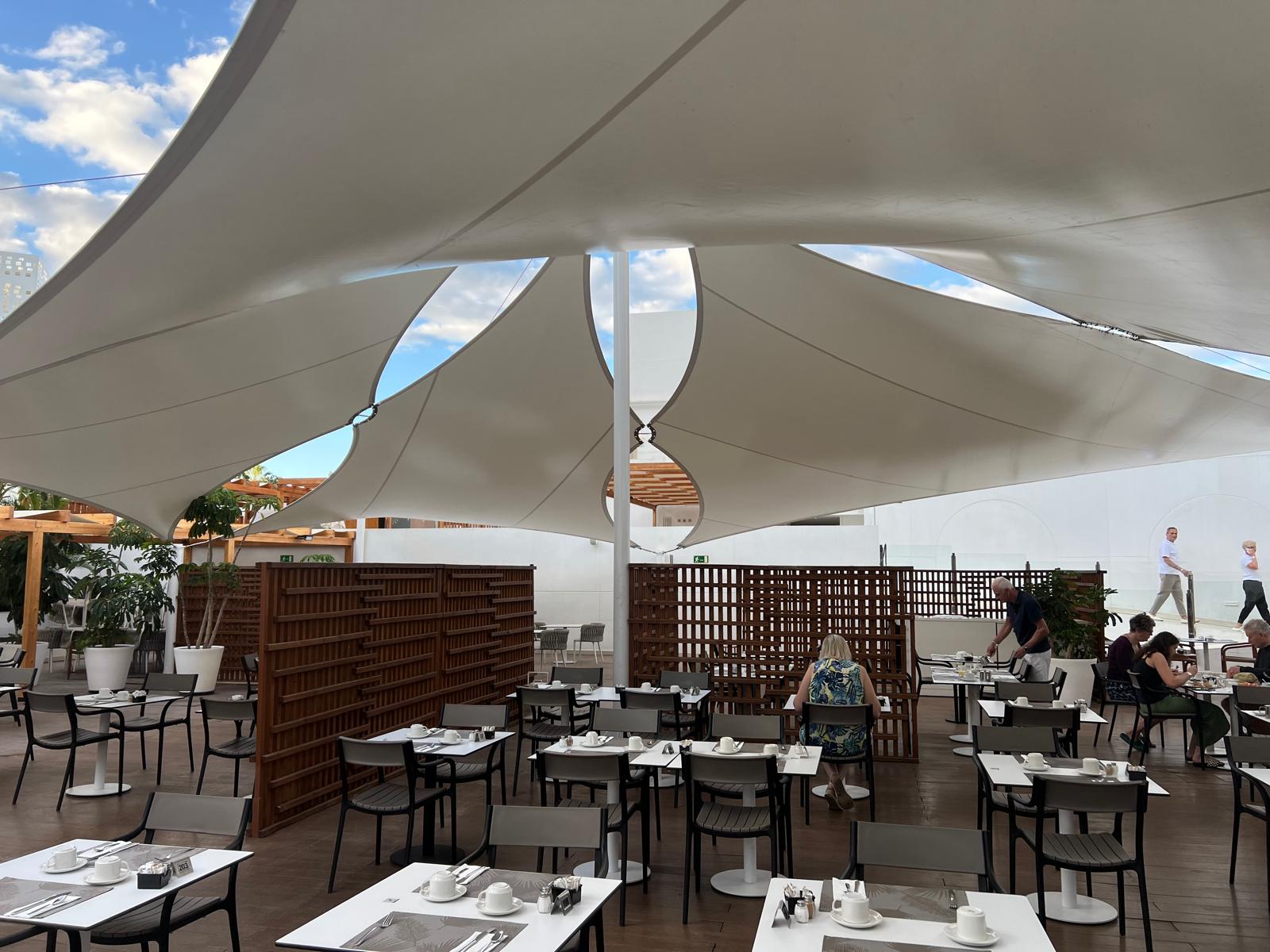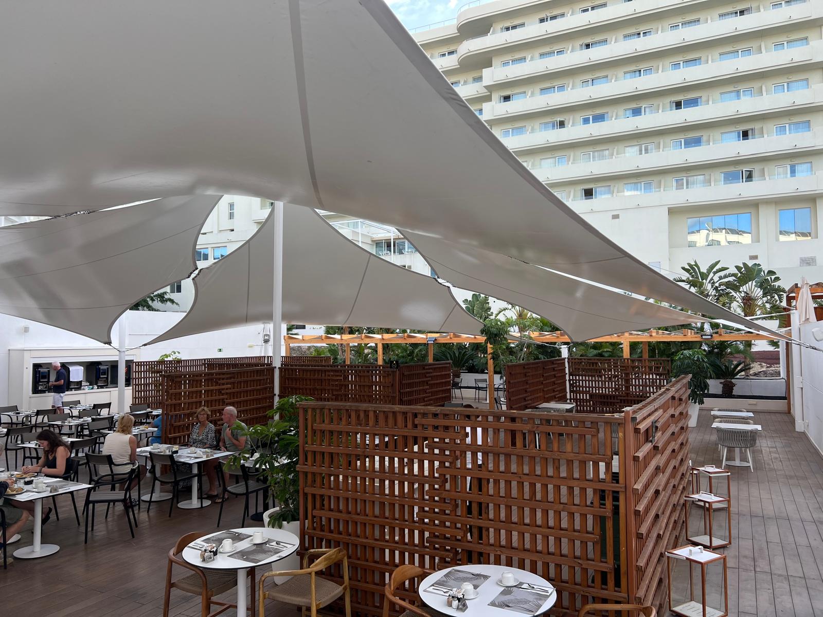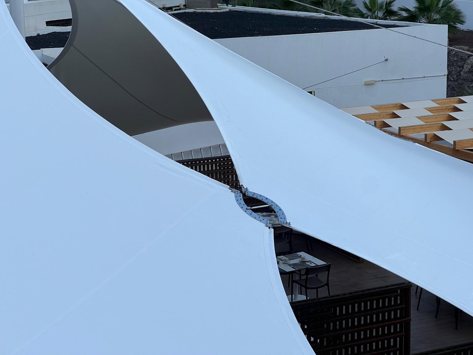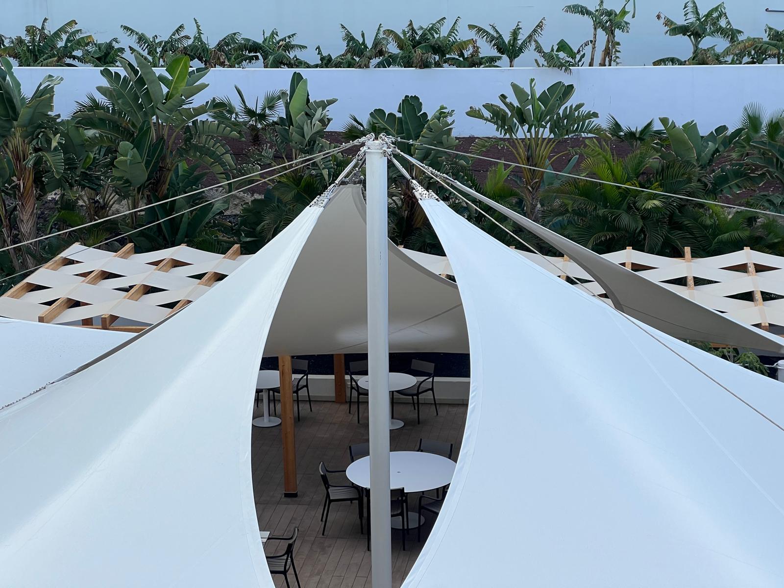 La instalación se realizó en la terraza del restaurante del Hotel Guayarmina Princess, ubicado en Adeje, Tenerife, con el objetivo de generar zonas de sombra, confort térmico y mejora estética del espacio.