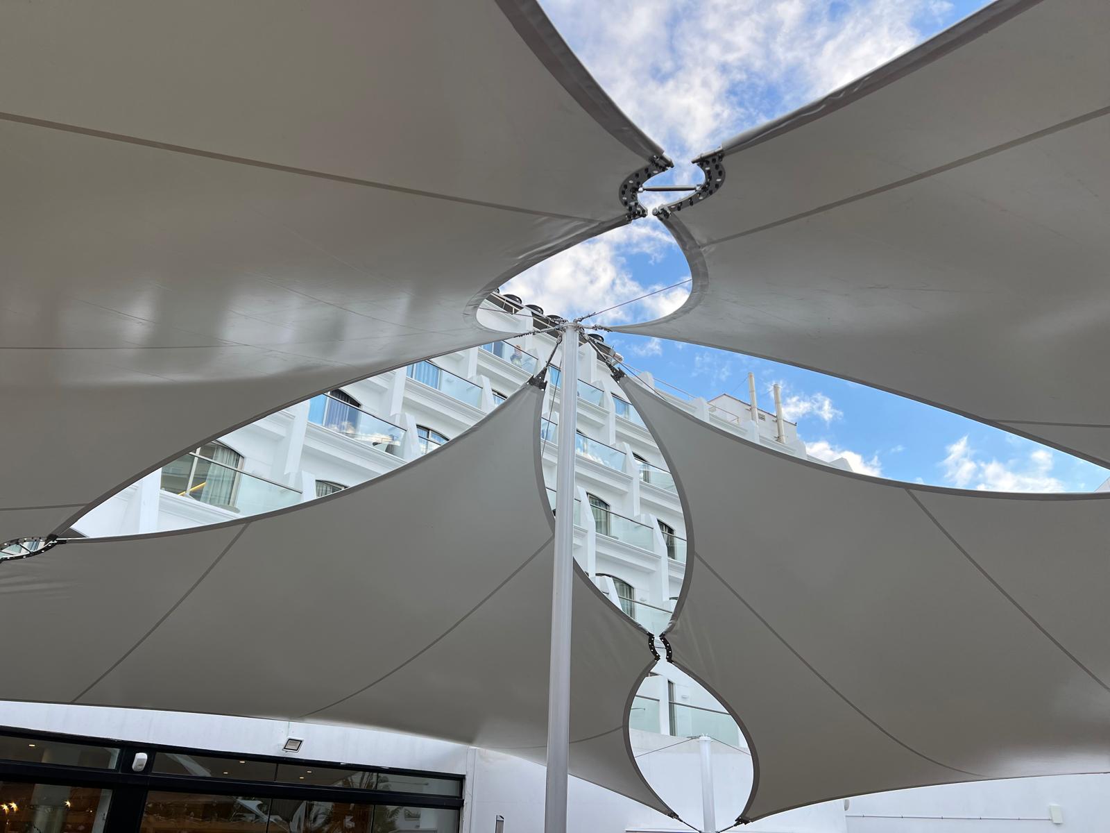 Proyecto integral de diseño, fabricación e instalación de estructuras de arquitectura textil ligera mediante la ejecución de 4 velas tensadas paraboloides hiperbólicas.