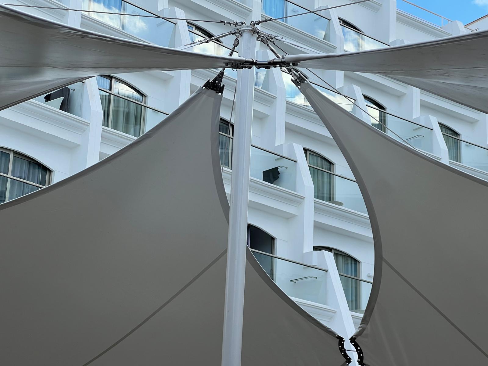 Las velas se fabricaron mediante el sistema de membranas textiles tensadas, empleando materiales técnicos de alta resistencia y durabilidad, especialmente diseñados para instalaciones permanentes en exteriores.